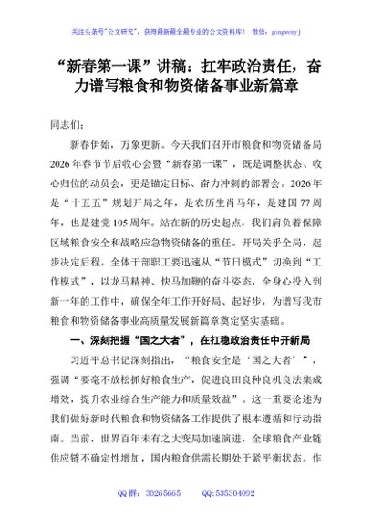 / “新春第一课”讲稿:扛牢政治责任,奋力谱写粮食和物资储备事业新篇章