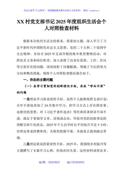 / XX村党支部书记2025年度组织生活会个人对照检查材料