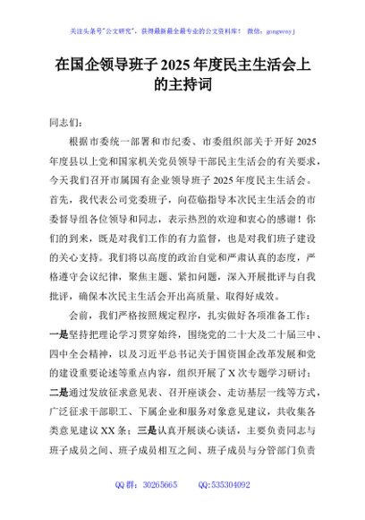 / 在国企领导班子2025年度民主生活会上的主持词