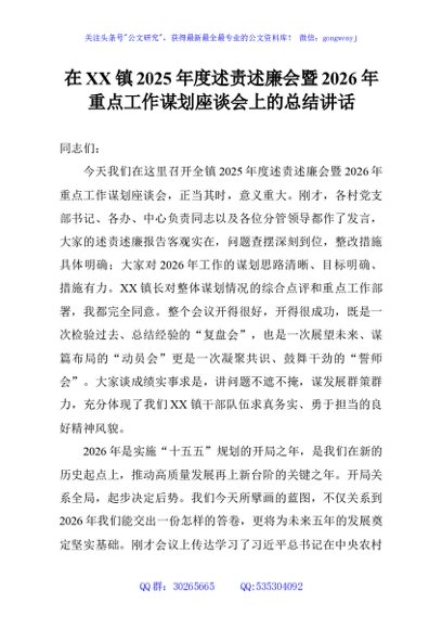/ 在XX镇2025年度述责述廉会暨2026年重点工作谋划座谈会上的总结讲话
