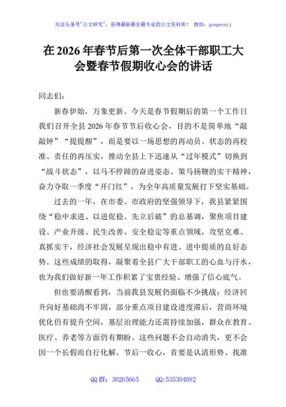 / 在2026年春节后第一次全体干部职工大会暨春节假期收心会的讲话