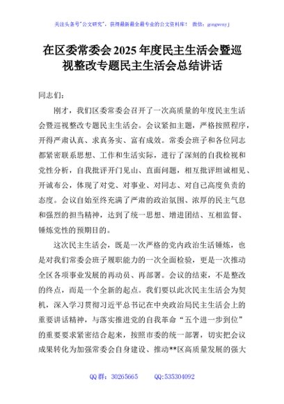 / 在区委常委会2025年度民主生活会暨巡视整改专题民主生活会总结讲话