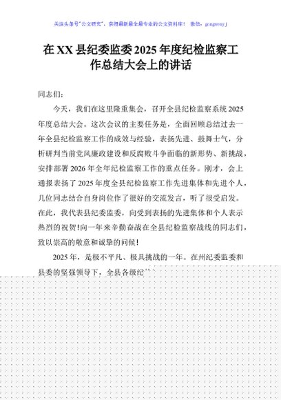 / 在XX县纪委监委2025年度纪检监察工作总结大会上的讲话