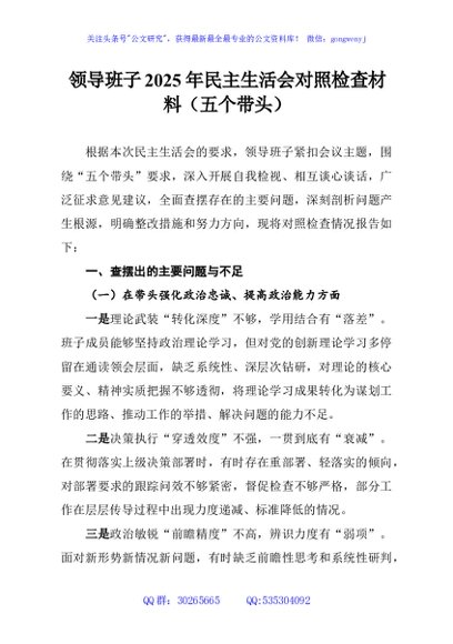 / 领导班子2025年民主生活会对照检查材料(五个带头)