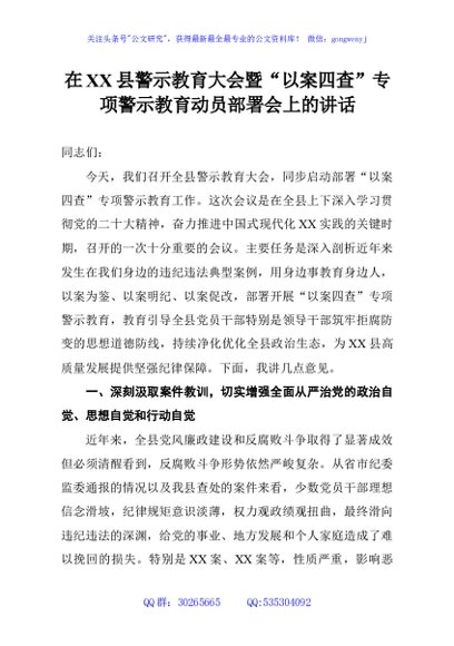 / 在XX县警示教育大会暨“以案四查”专项警示教育动员部署会上的讲话