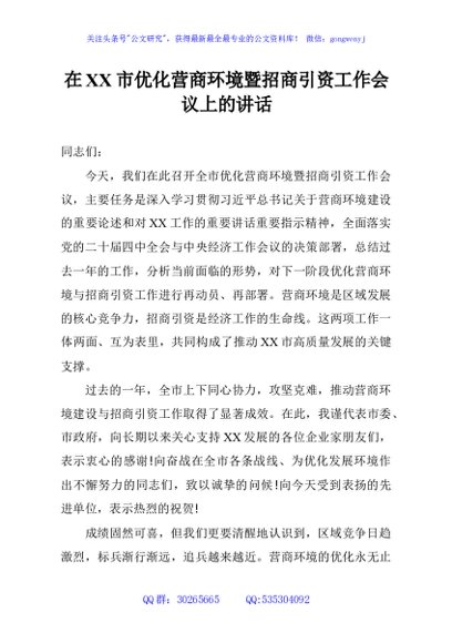 / 在XX市优化营商环境暨招商引资工作会议上的讲话