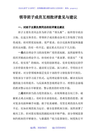 领导班子成员互相批评意见与建议