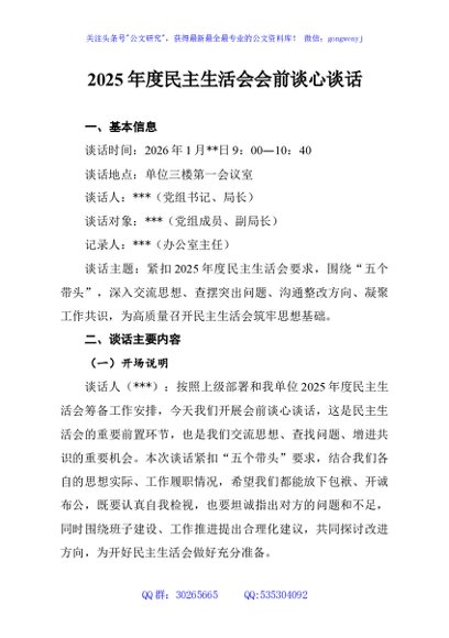 2025年度民主生活会会前谈心谈话
