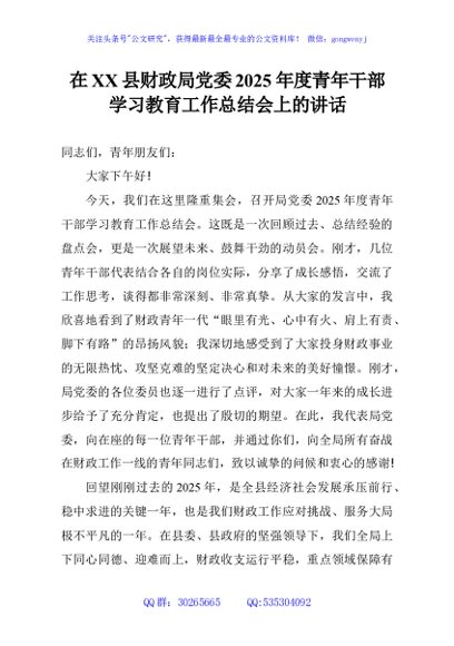 / 在XX县财政局党委2025年度青年干部学习教育工作总结会上的讲话