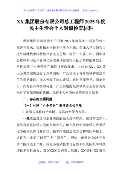 / XX集团股份有限公司总工程师2025年度民主生活会个人对照检查材料