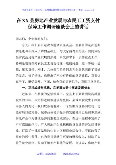 / 在XX县房地产业发展与农民工工资支付保障工作调研座谈会上的讲话