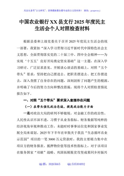 / 中国农业银行XX县支行2025年度民主生活会个人对照检查材料