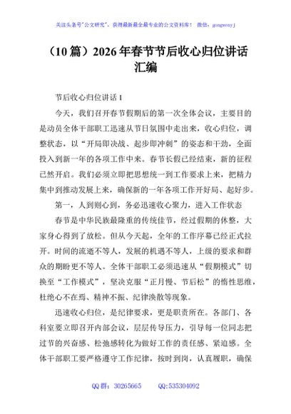 / (10篇)2026年春节节后收心归位讲话汇编