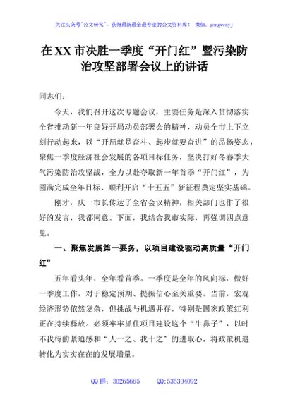 / 在XX市决胜一季度“开门红”暨污染防治攻坚部署会议上的讲话