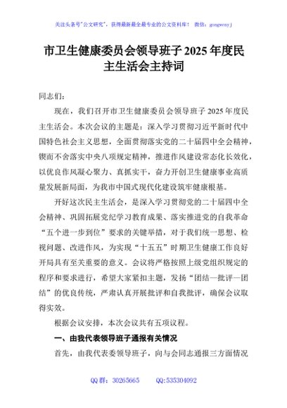/ 市卫生健康委员会领导班子2025年度民主生活会主持词