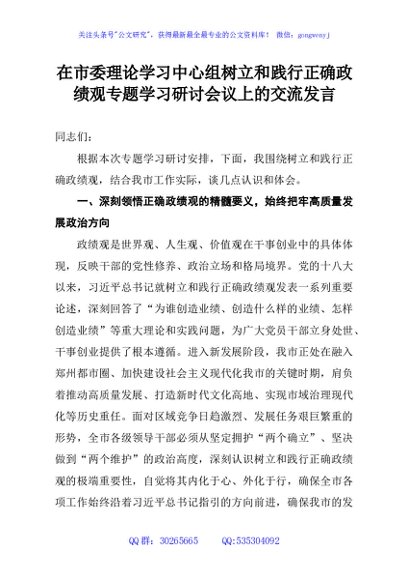 / 在市委理论学习中心组树立和践行正确政绩观专题学习研讨会议上的交流发言