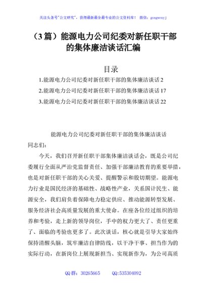 / (3篇)能源电力公司纪委对新任职干部的集体廉洁谈话汇编