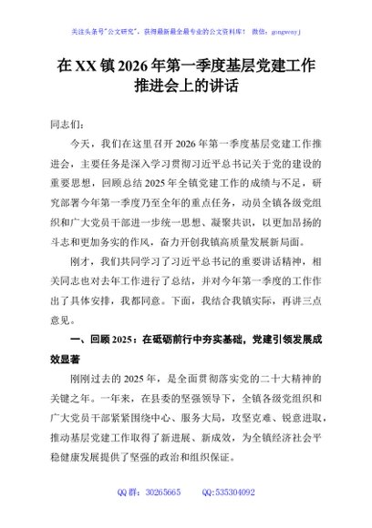 / 在XX镇2026年第一季度基层党建工作推进会上的讲话