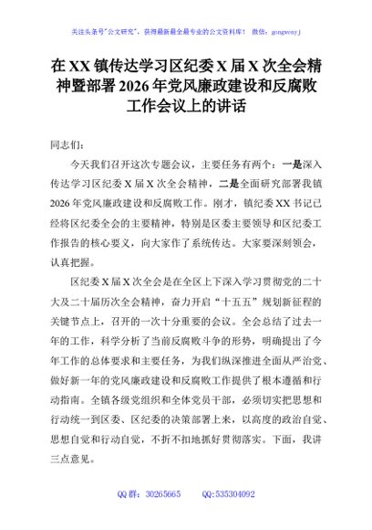 / 在XX镇传达学习区纪委X届X次全会精神暨部署2026年党风廉政建设和反腐败工作会议上的讲话