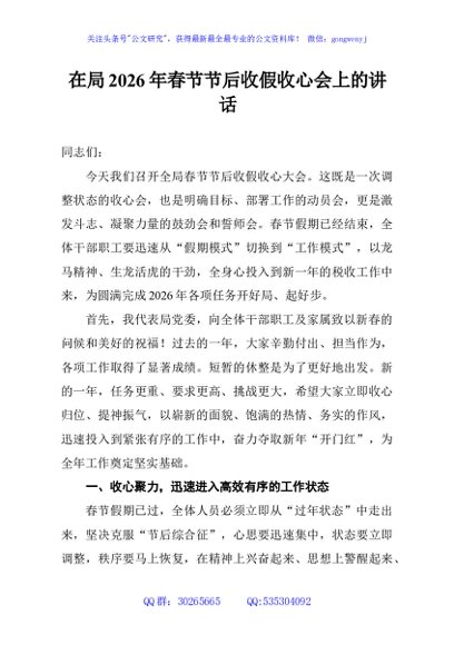 / 在局2026年春节节后收假收心会上的讲话