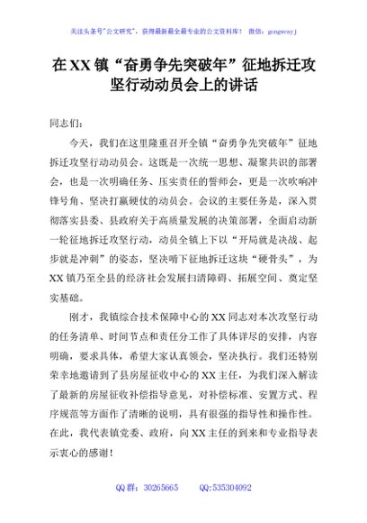 / 在XX镇“奋勇争先突破年”征地拆迁攻坚行动动员会上的讲话