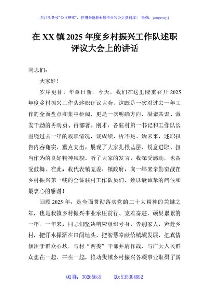 / 在XX镇2025年度乡村振兴工作队述职评议大会上的讲话
