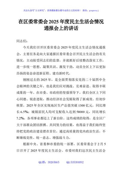 / 在区委常委会2025年度民主生活会情况通报会上的讲话
