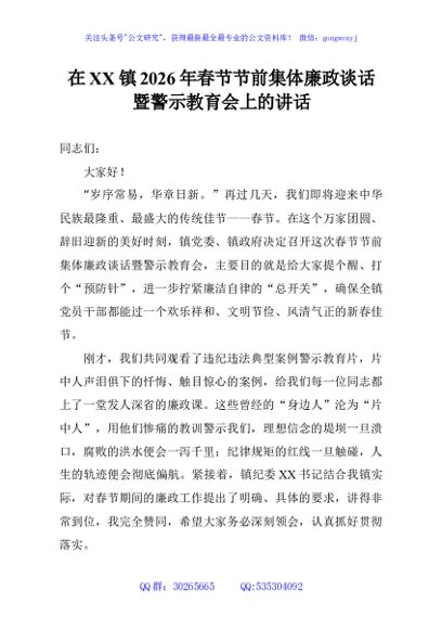 / 在XX镇2026年春节节前集体廉政谈话暨警示教育会上的讲话