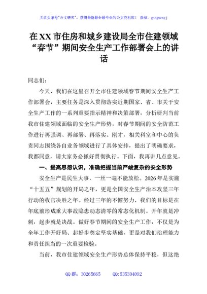 / 在XX市住房和城乡建设局全市住建领域“春节”期间安全生产工作部署会上的讲话