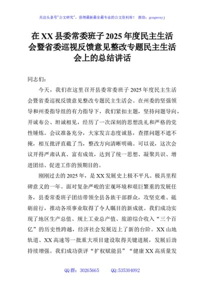 / 在XX县委常委班子2025年度民主生活会暨省委巡视反馈意见整改专题民主生活会上的总结讲话