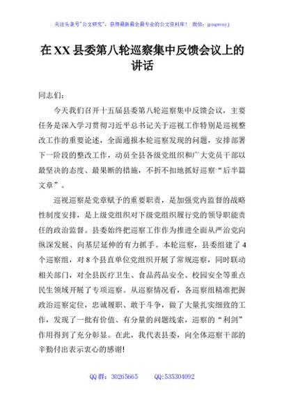 / 在XX县委第八轮巡察集中反馈会议上的讲话