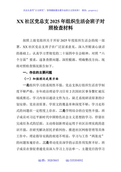 / XX社区党总支2025年组织生活会班子对照检查材料