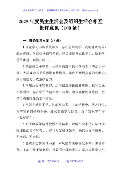 / 2025年度民主生活会及组织生活会相互批评意见(100条)