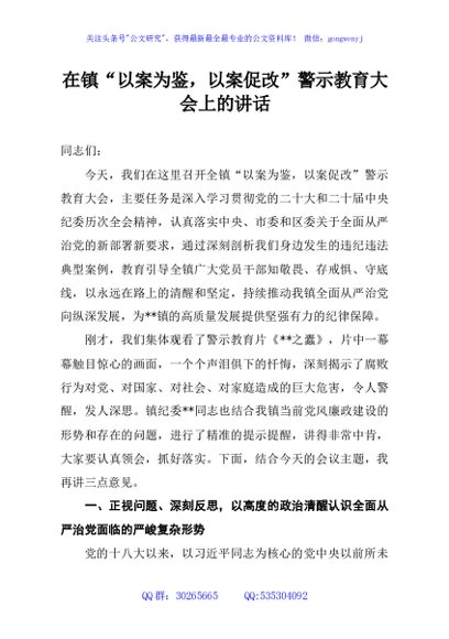 / 在镇“以案为鉴,以案促改”警示教育大会上的讲话
