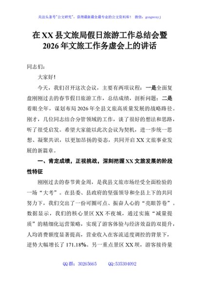 / 在XX县文旅局假日旅游工作总结会暨2026年文旅工作务虚会上的讲话