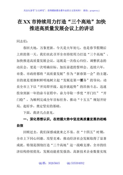 / 在XX市持续用力打造“三个高地”加快推进高质量发展会议上的讲话