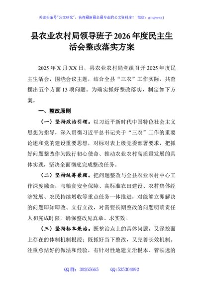 / 县农业农村局领导班子2026年度民主生活会整改落实方案