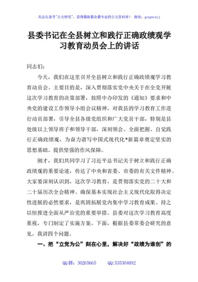 / 县委书记在全县树立和践行正确政绩观学习教育动员会上的讲话