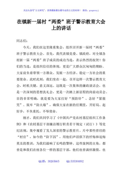 / 在镇新一届村“两委”班子警示教育大会上的讲话
