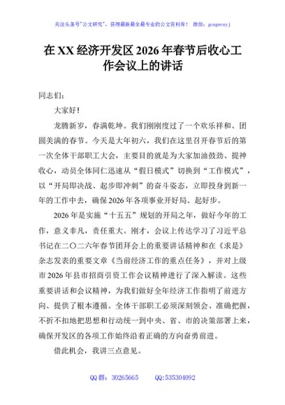 / 在XX经济开发区2026年春节后收心工作会议上的讲话