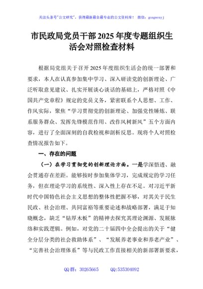 / 市民政局党员干部2025年度专题组织生活会对照检查材料