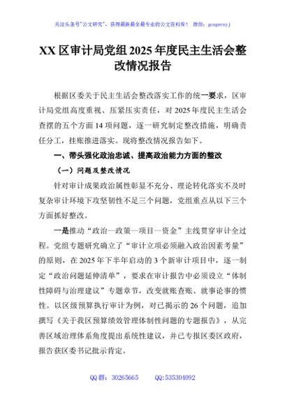 / XX区审计局党组2025年度民主生活会整改情况报告