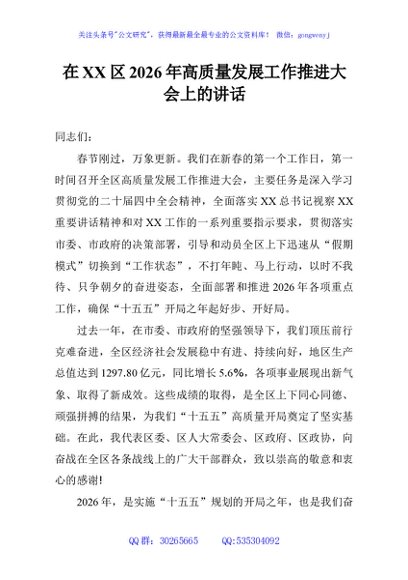 / 在XX区2026年高质量发展工作推进大会上的讲话