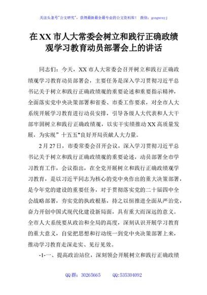 / 在XX市人大常委会树立和践行正确政绩观学习教育动员部署会上的讲话
