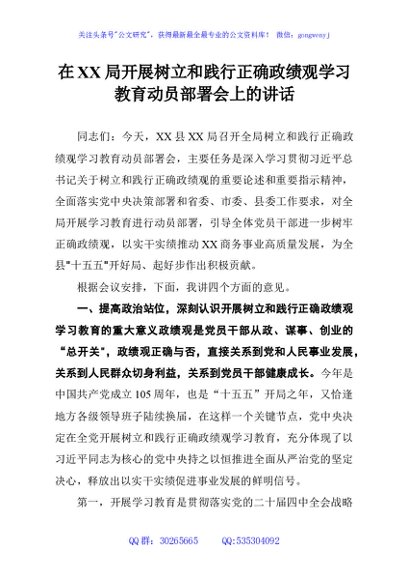 / 在XX局开展树立和践行正确政绩观学习教育动员部署会上的讲话