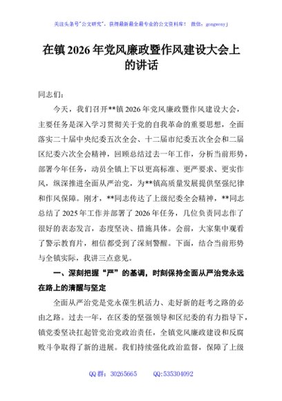 / 在镇2026年党风廉政暨作风建设大会上的讲话