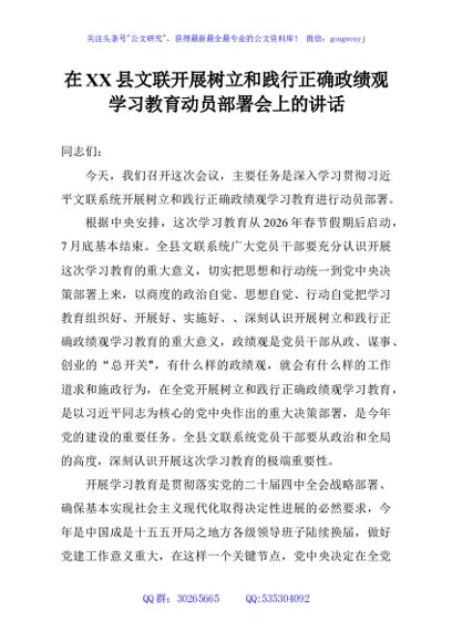/ 在XX县文联开展树立和践行正确政绩观学习教育动员部署会上的讲话