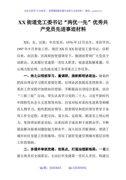 / XX街道党工委书记“两优一先”优秀共产党员先进事迹材料