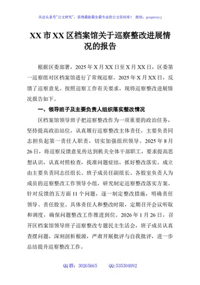 / XX市XX区档案馆关于巡察整改进展情况的报告