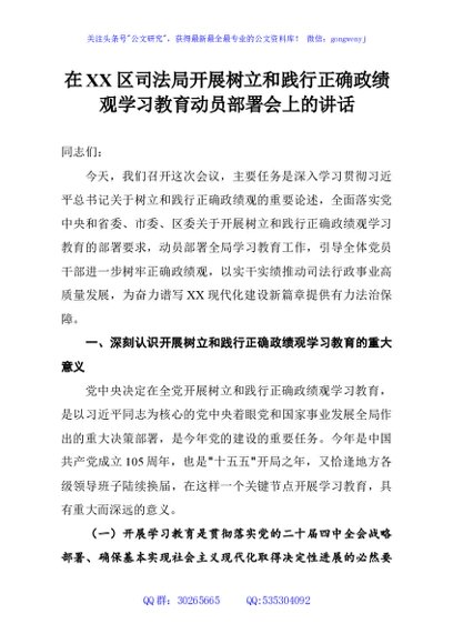 / 在XX区司法局开展树立和践行正确政绩观学习教育动员部署会上的讲话